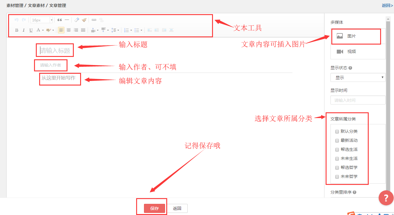 提示:如需对文章进行管理, 请先设置文章分类。以便建立文章的时候可以将文章放入对应的分类。方便管理。