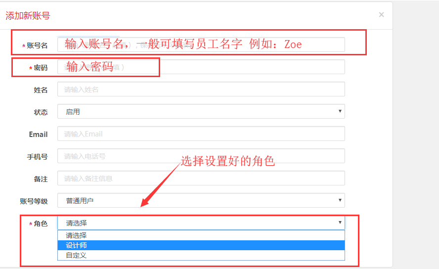 第三步,填入账号名、密码(自编)、选择角色,保存即可。