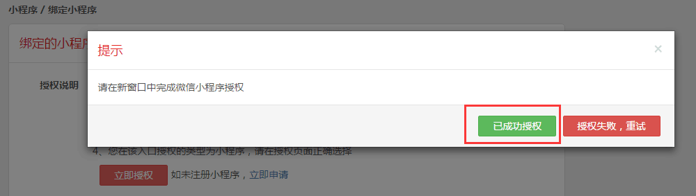第四步,回到旺豹系统点击“已成功授权”,完成绑定小程序。