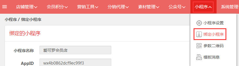第一步,登入旺豹系统, 进入“小程序→绑定小程序”。
