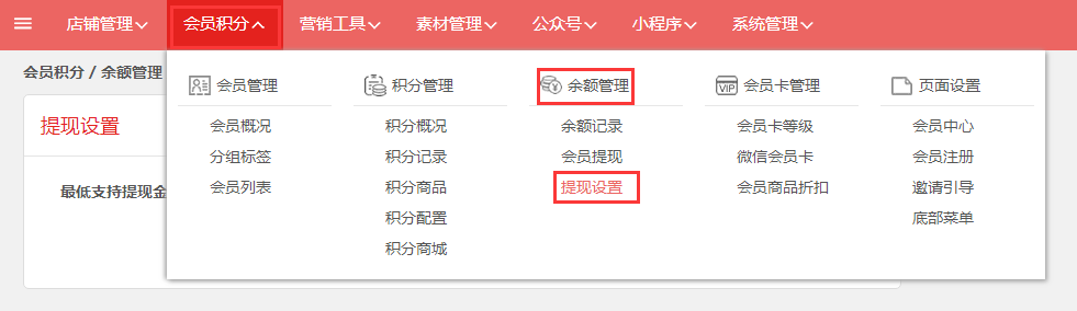 第一步,登入旺豹后台,点击“会员积分→余额管理→提现设置”。