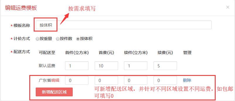 *按件体积:单笔订单首时件N立方米,首费M元,每续件n立方米,续费m元;如,首件1立方米,首费10元,每续1立方米,续费5元,则买家购买了2立方米商品,第1件按10元收取,第2立方米,按5元收取,合计15元;(不足2立方米,按照2立方米计算)。