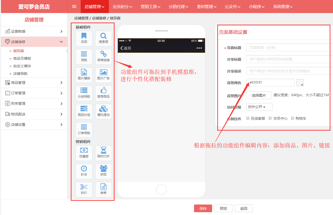 1)功能组件可拖拉到手机模拟框,进行个性化搭配装修,右边的编辑框可对拖拉的功能组件编辑内容:添加商品、图片、链接、命名...