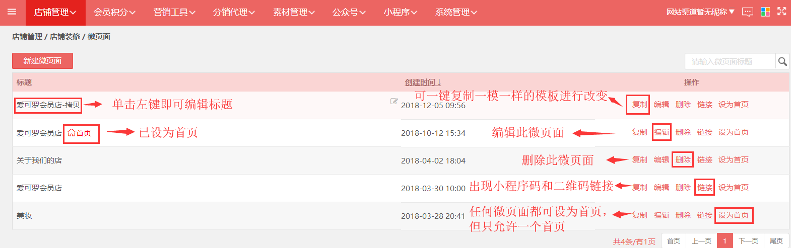 第一步,登入旺豹后台,点击“店铺管理→店铺装修→微页面”。