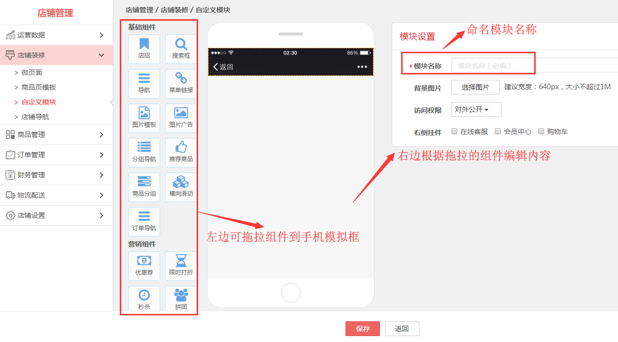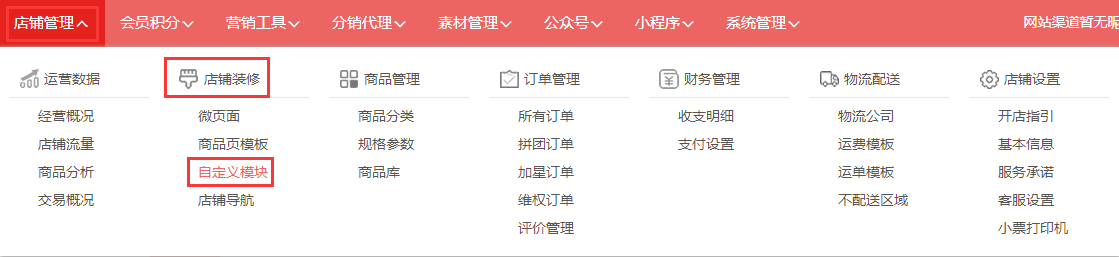 第四步,创建后的自定义模块可以在“店铺管理→店铺装修→微页面”编辑时,选择功能组件“自定义”进行选择添加。