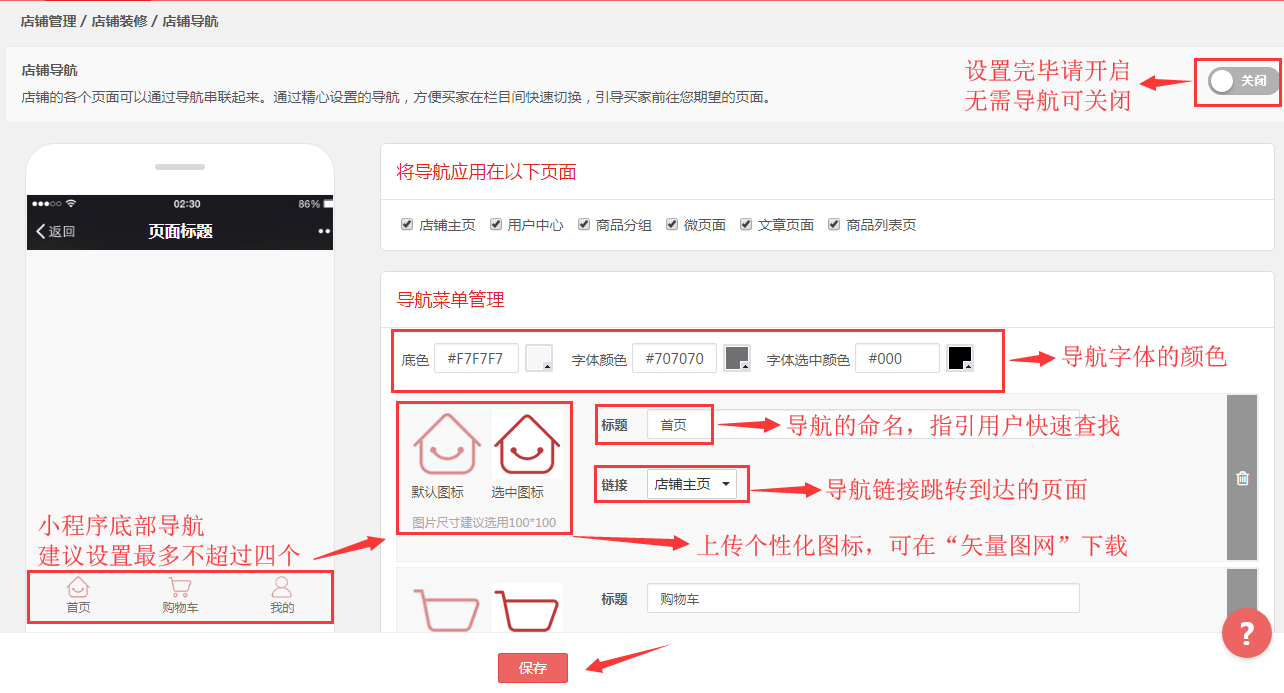 设置完毕务必保存后点击开启按钮, 如果无需导航可以点击关闭。