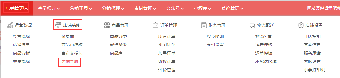 第一步,登入旺豹后台,点击“店铺管理→店铺装修→店铺导航”。