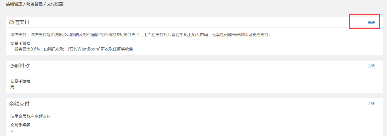 第二步,进入支付设置页面,在微信支付栏点击“安装”。