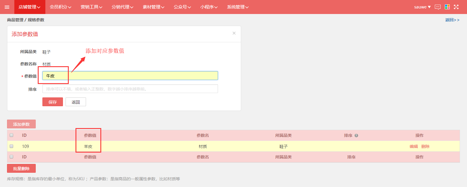 第一步,登入旺豹后台,点击“店铺管理→商品管理→规格参数”。点击数字,添加规格/参数。