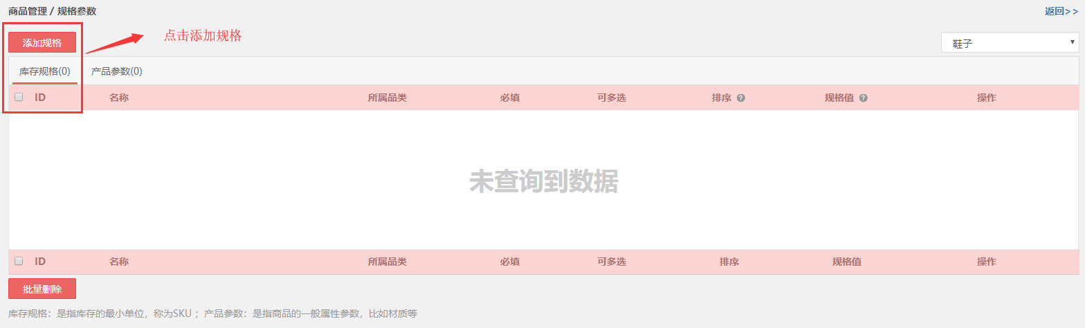 在此处添加规格参数,前提要先设置好商品类目。