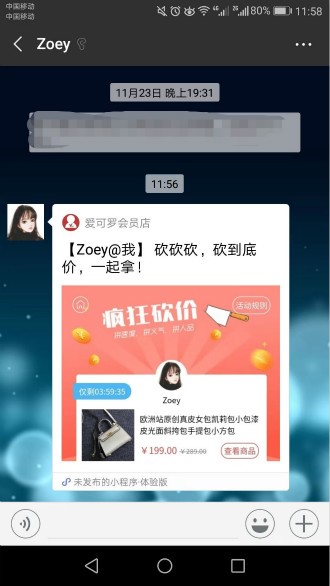 消费者选好商品发起砍价后,转发至微信群聊,邀请群友帮忙砍价。好友帮忙砍价后,发现有优惠券赠送,也会邀请自己的好友帮忙砍价,并进店逛逛,由此实现裂变,短期内辐射至大量用户。