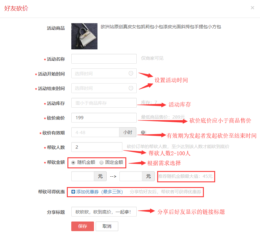 4)商家选择商品配置好砍价后,活动期间内,商品规格不能新增、修改,商品库中商品价格和库存的变更不会影响活动价格及库存,但活动时间不可以延长;