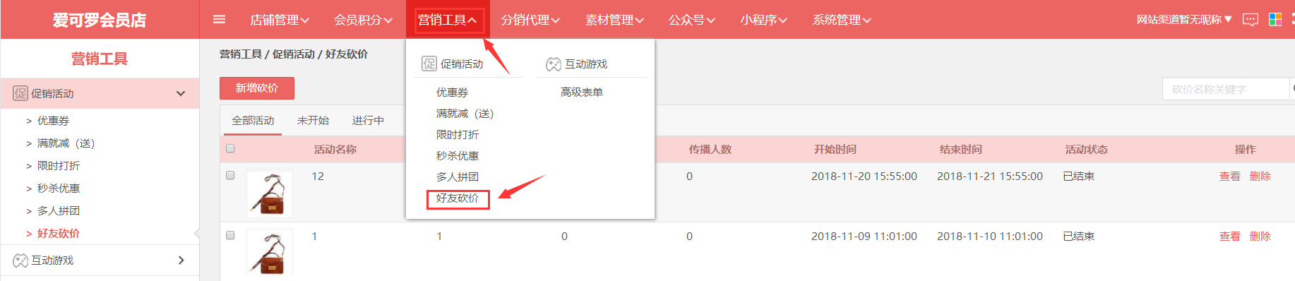 商家可登录店铺后台电脑端→营销工具→好友砍价