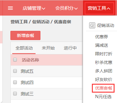 第一步,登入旺豹后台,点击“营销工具→优惠套餐”。