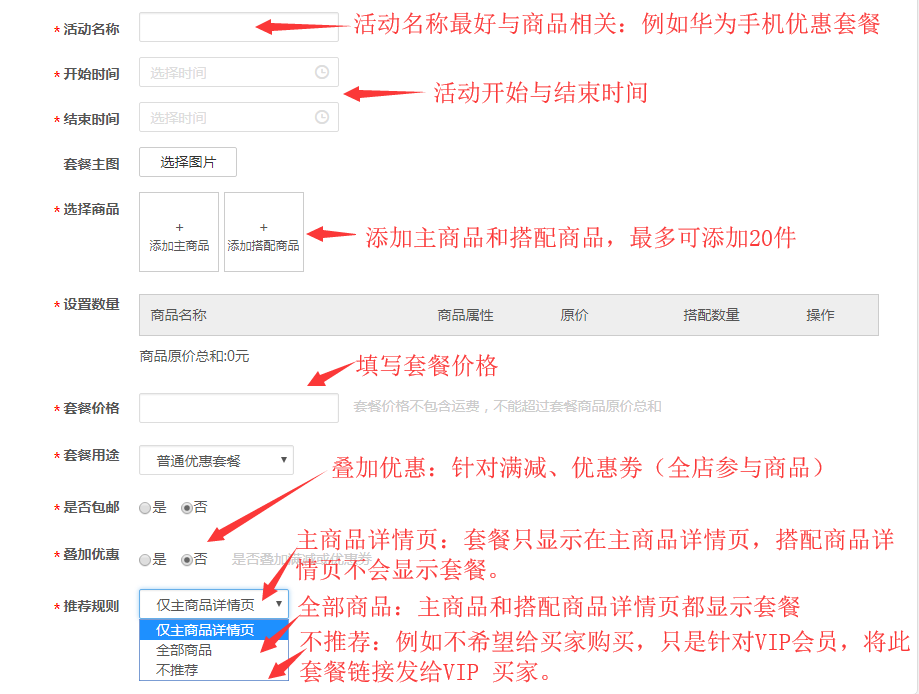 4)套餐价格:套餐价格不包含运费,不能超过套餐商品原价总和。