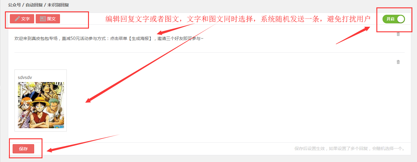 第二步,编辑用户未识别回复的文字或者图文,保存后点击“开启”按钮。