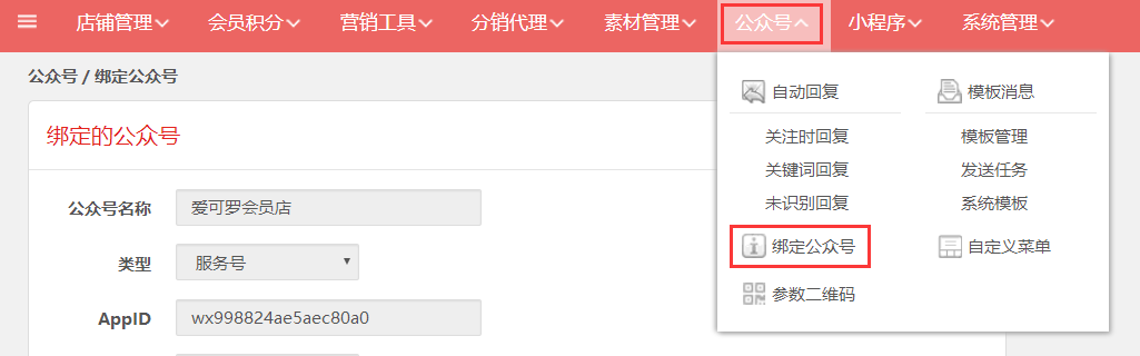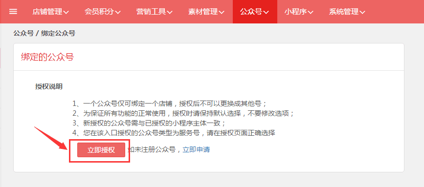 绑定公众号是指商家将公众号授权给旺豹系统,进行店铺的设置与管理。