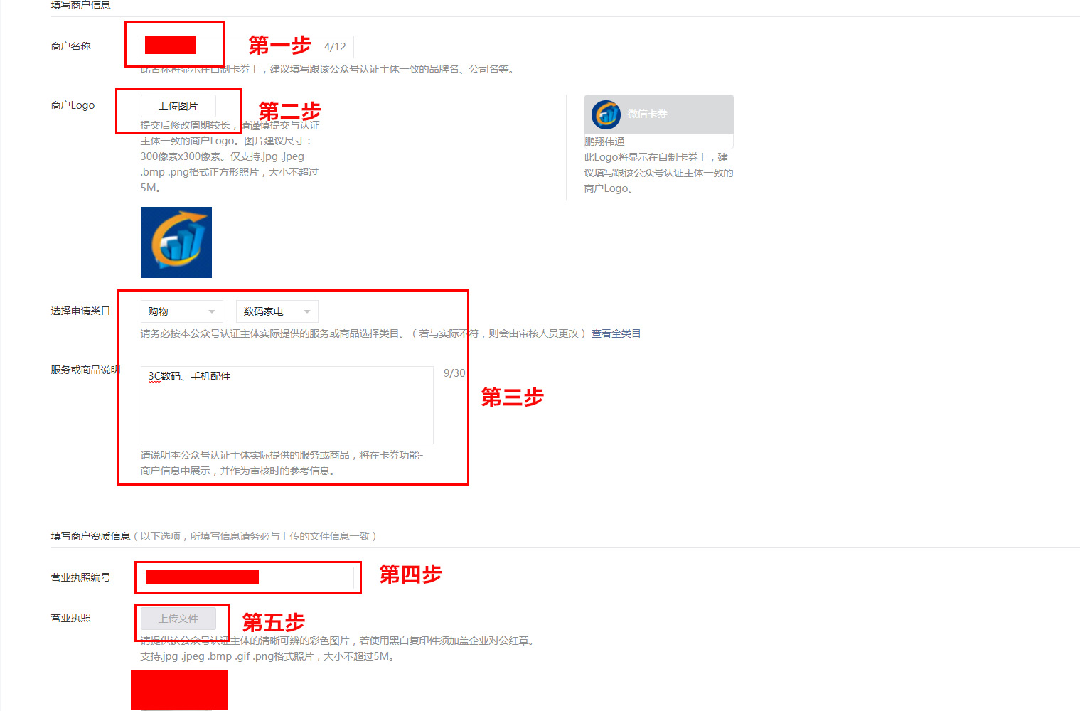 第四步,填写资料保存,等待腾讯审核通过,一般2个工作日回到公众号查看就有卡卷功能。