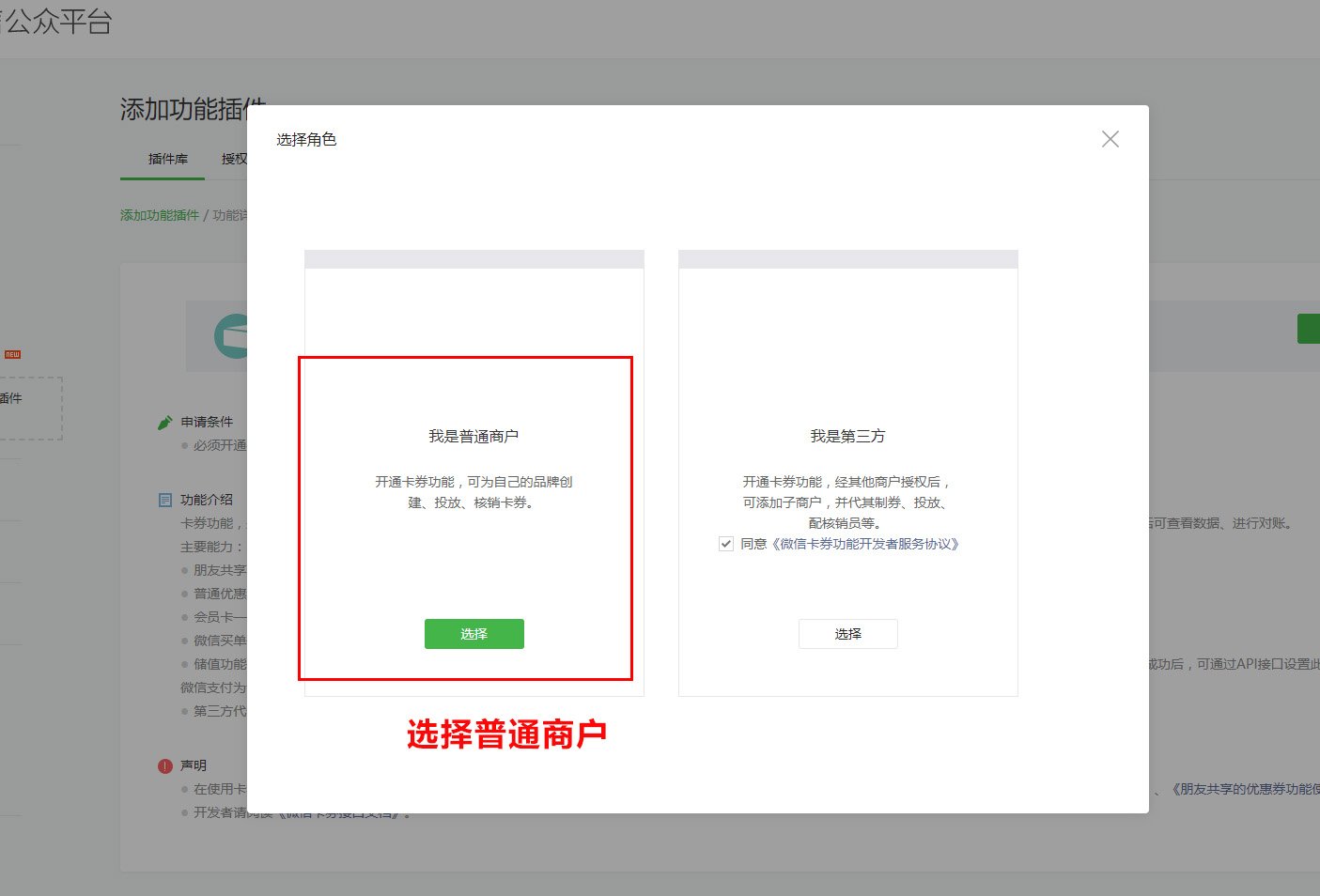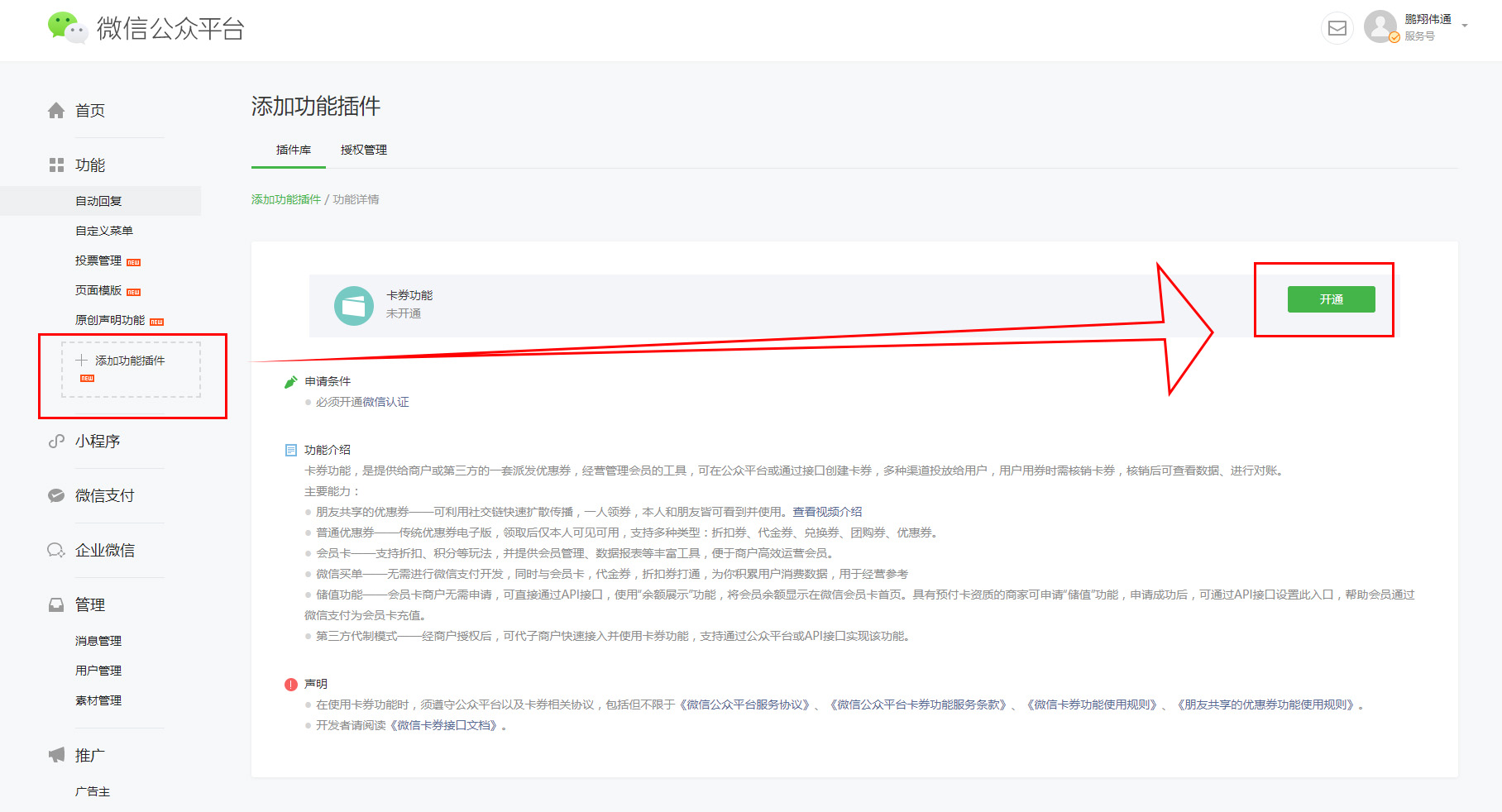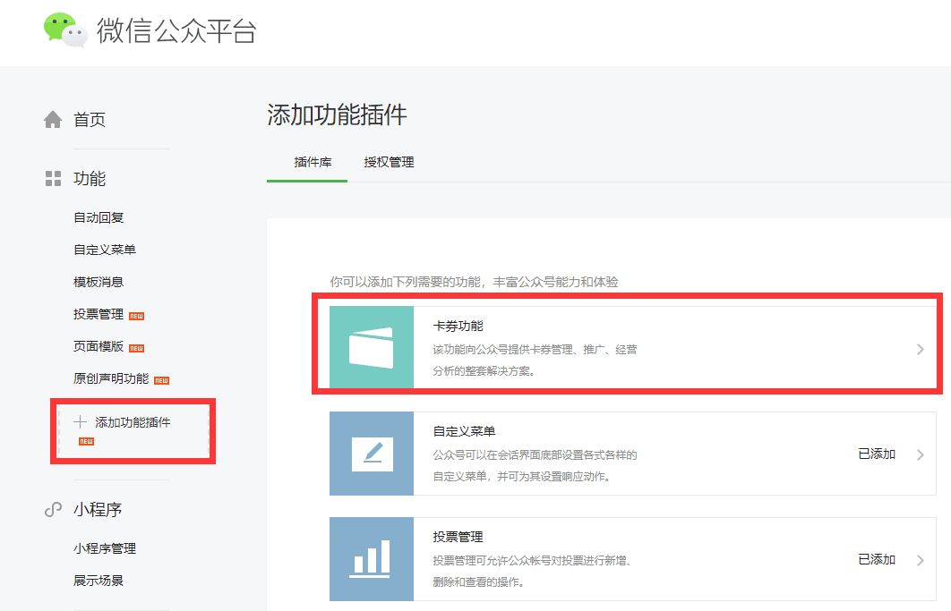第一步,登陆你的微信公众号平台,点击“添加功能插件”,选择“卡券功能”。