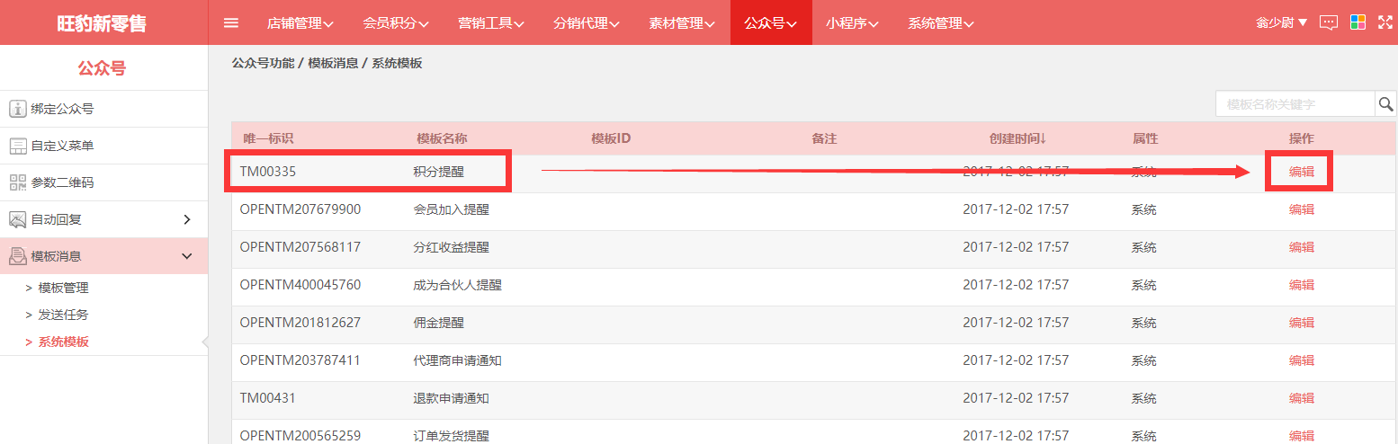6)回到旺豹系统,选择对应的模板名称,点击编辑。