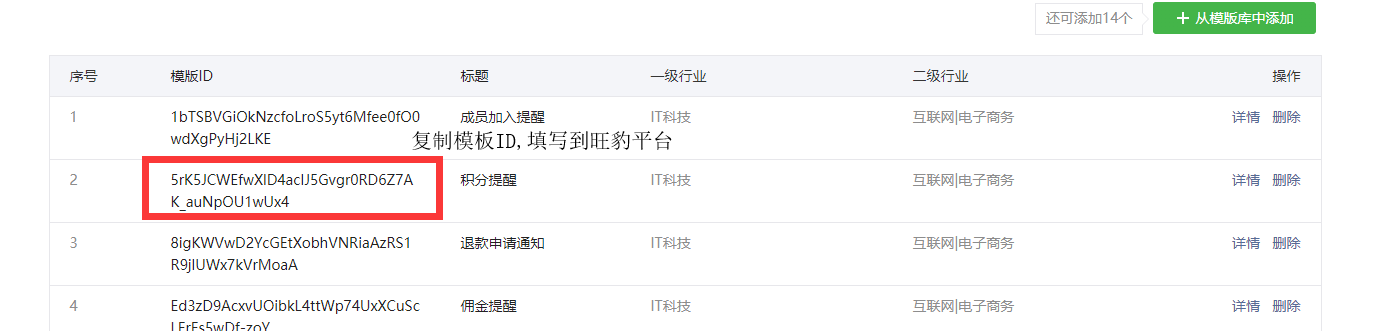 5)添加后,点击公众号左边工具栏的“模板消息”,就有显示刚刚添加的模板,然后复制模板ID。
