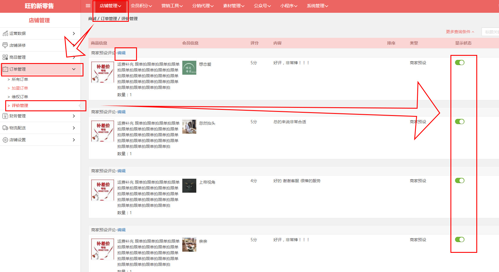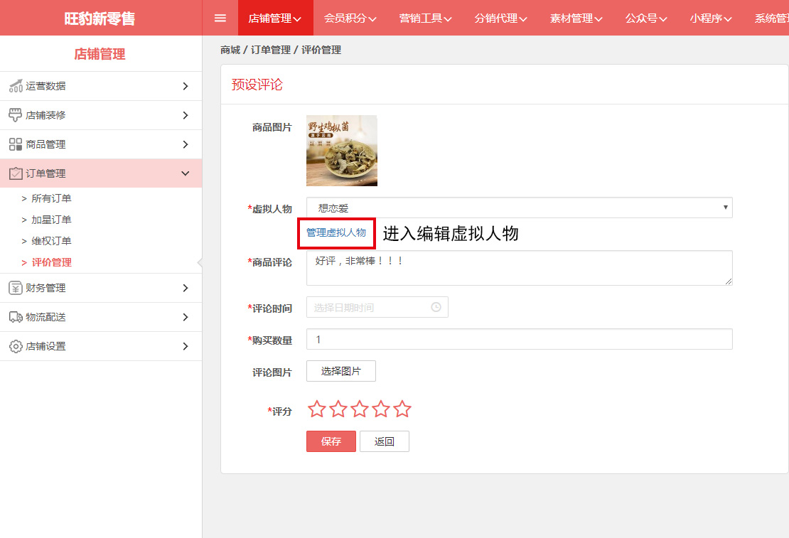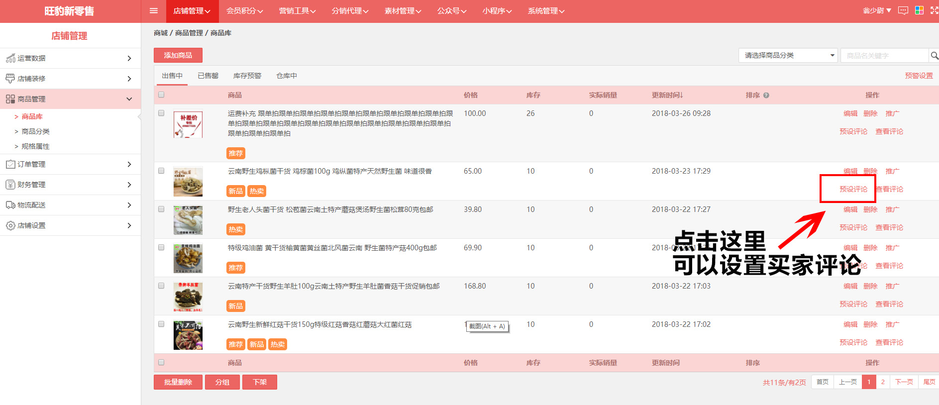 第一步,登入旺豹系统,点击店铺管理→商品管理→商品库,正在出售的商品可以增加虚拟评论,如图点击商品右手边的“预设评论”。