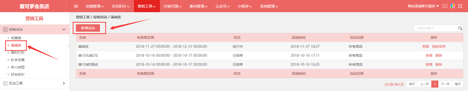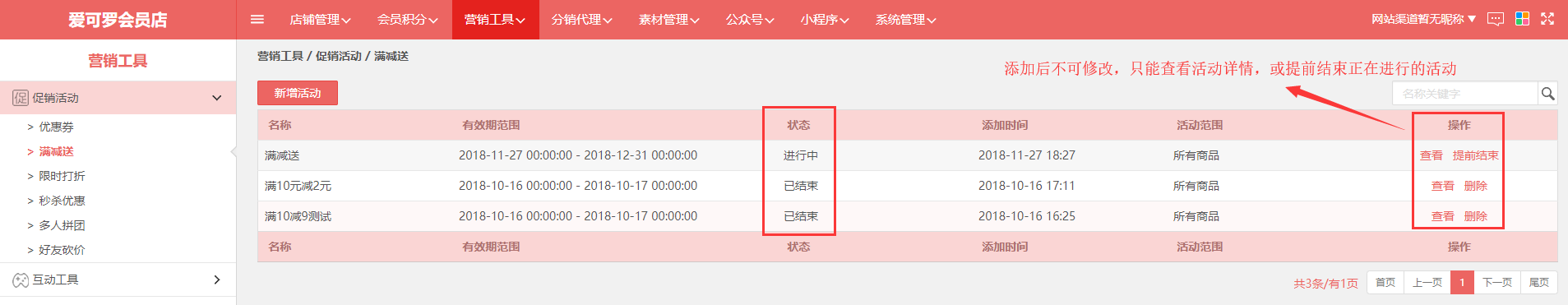 满减送活动设置之后,在活动列表,每个活动后面会有一个提前结束选项。