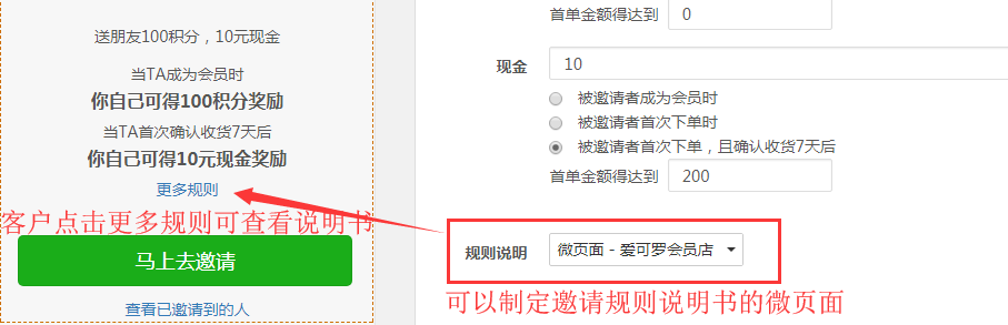 2)如有需要可以到微页面制定邀请规则说明书,用户点击“更多规则”可以查看说明书。(可设、可不设)